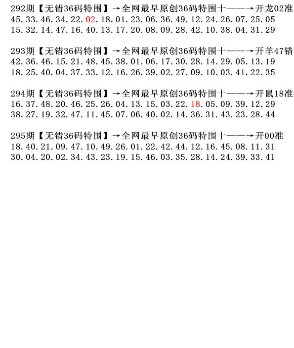 295期9码 | 19.25.33.41.36.10.39.26.04 | ?00中 |